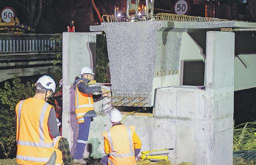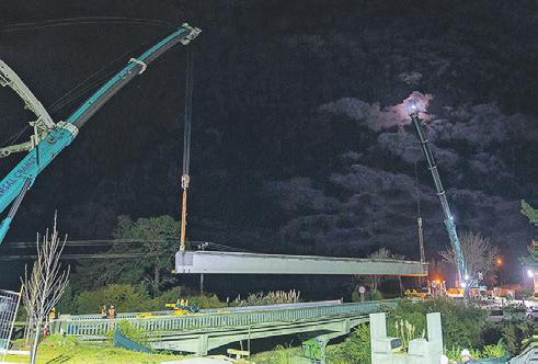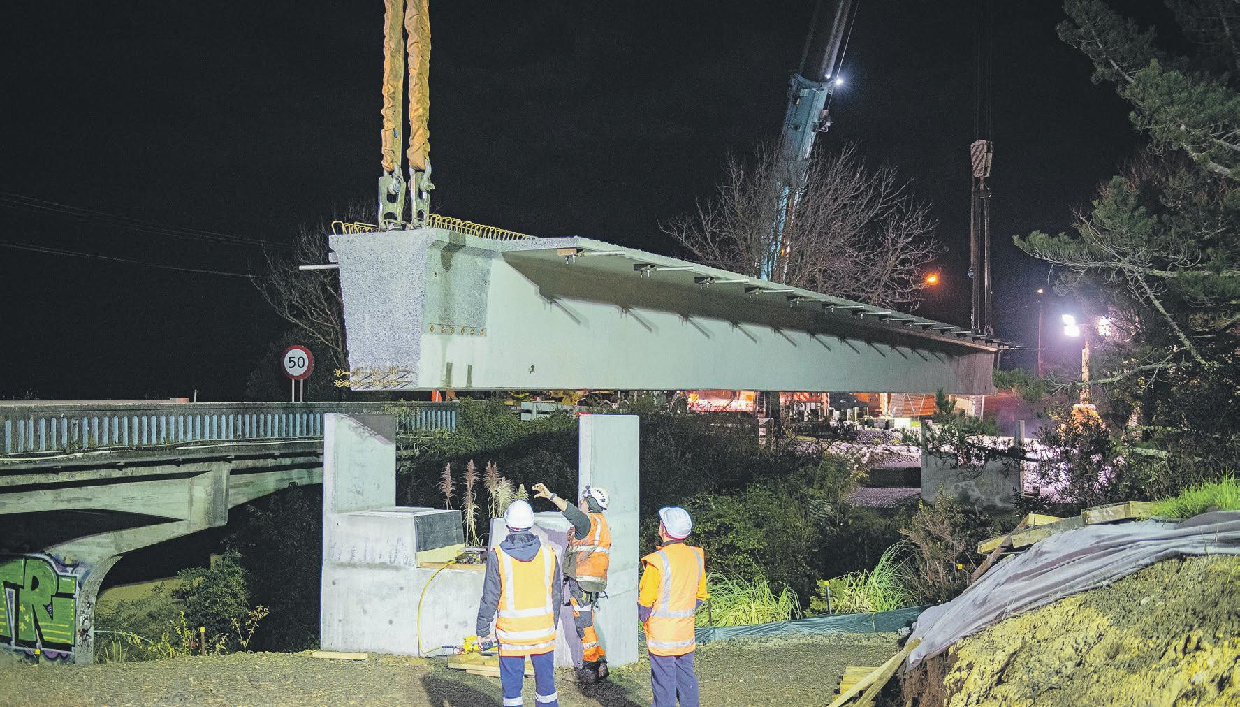 A 30-metre long footbridge weighing 76 tonnes was craned into place over the railway line in Rodney Street, Wellsford last week. The midnight manoeuvre required a tandem crane operation to lift it into place during a full overnight road closure. Contractors Wharehine Group says work will now continue to install the footbridge handrails, bridge deck and final section of footpath. Funded by the Rodney Transport Targeted Rate, the bridge will provide a pedestrian link to Centennial Park and will open later this year.