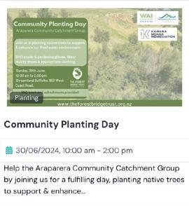 30 Community Planting Day, Streamland Suffolks, 903 West Coast Road Ahuroa, 10am-2pm. BYO spade and gardening gloves. Wear sturdy shoes and appropriate clothing suitable for planting and the weather. BBQ lunch & refreshments provided. Info & RSVP: katie@theforestbridgetrust.org.nz