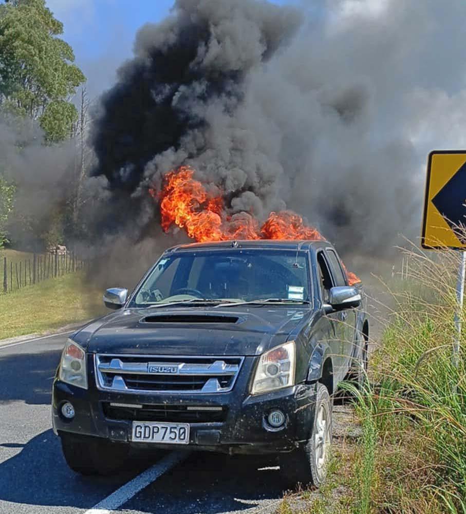 Traffic along Mangawhai Road was blocked for over an hour-and-a-half as three emergency services attended the incident. In the smoky aftermath, all that remained was a burnt out carcass, with the ute’s hardback canopy completely melted and work equipment destroyed.
