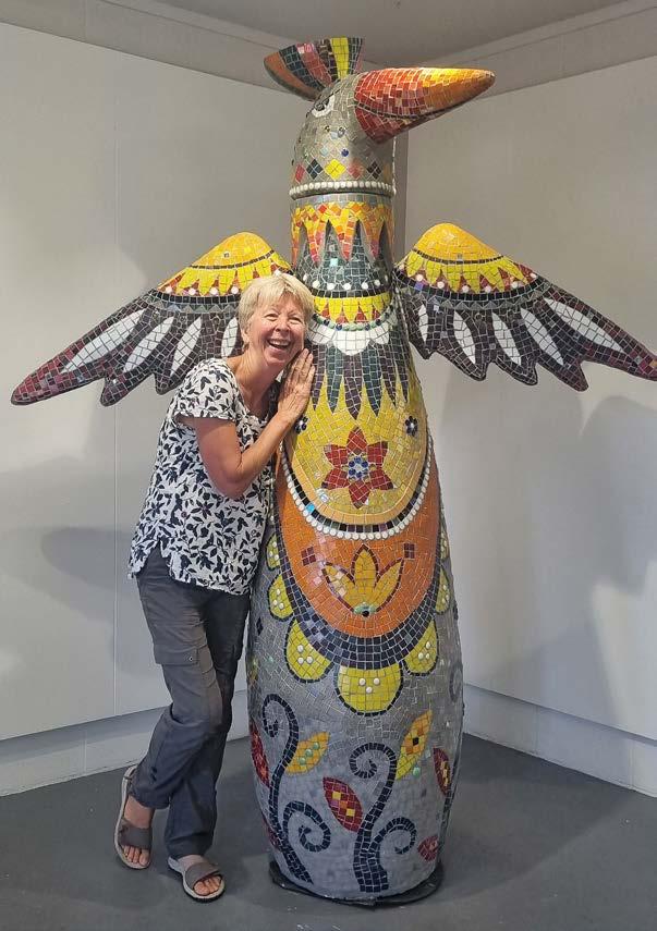 The largest artwork ever housed at Mangawhai Art Gallery (MAI) ‘Tsarina Tamara’ flew the nest on March 6, enroute to its new home in Matakana. The stunning 1.8 metre totem bird will feature in a private sculpture garden, along with a giant giraffe statue and over 20 free-range chickens, each with their individual ‘house’. Mangawhai artists Elena Nikolaeva and Deva Prem spent two summers creating the mosaic bird from polystyrene, concrete and thousands of cut tiles and coloured gems. Although a hefty weight, Nikolaeva, MAI chair Howard Esler, artist Shann Whitaker and Prem, along with a helpful passing local, were able to manoeuvre the sculpture through the gallery doorway on a trolley, hoist it into the old oak tree outside and strap it safely into the back of a ute, without losing a single tile.