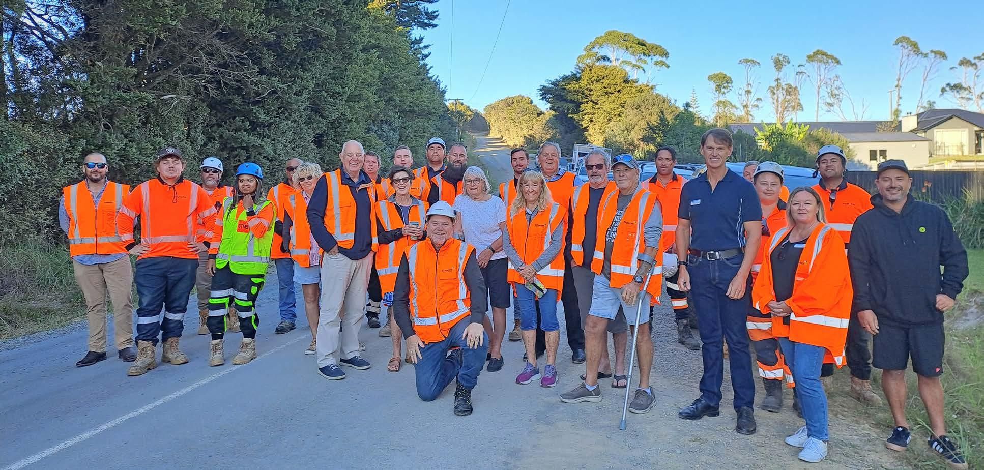 Dust nuisance will no longer be an issue for residents living along the west side of Devich Road after sealing works began on March 6. Improvements to the 1.1 kilometre gravel stretch from the oneway bridge to Lawrence Road include widening, strengthening and sealing, with the work expected to take six weeks. Mayor Craig Jepson, deputy Jonathan Larsen and councillors Mike Howard and Rachael Williams visited the site on the morning works started to meet with the Downer contracting crew, as well as a group of residents. The work is part of the Long-Term Plan with sealing also planned for Settlement Road from KaiwakaMangawhai Road to Hakaru Hall and two under-engineered sections of Cames Road.
