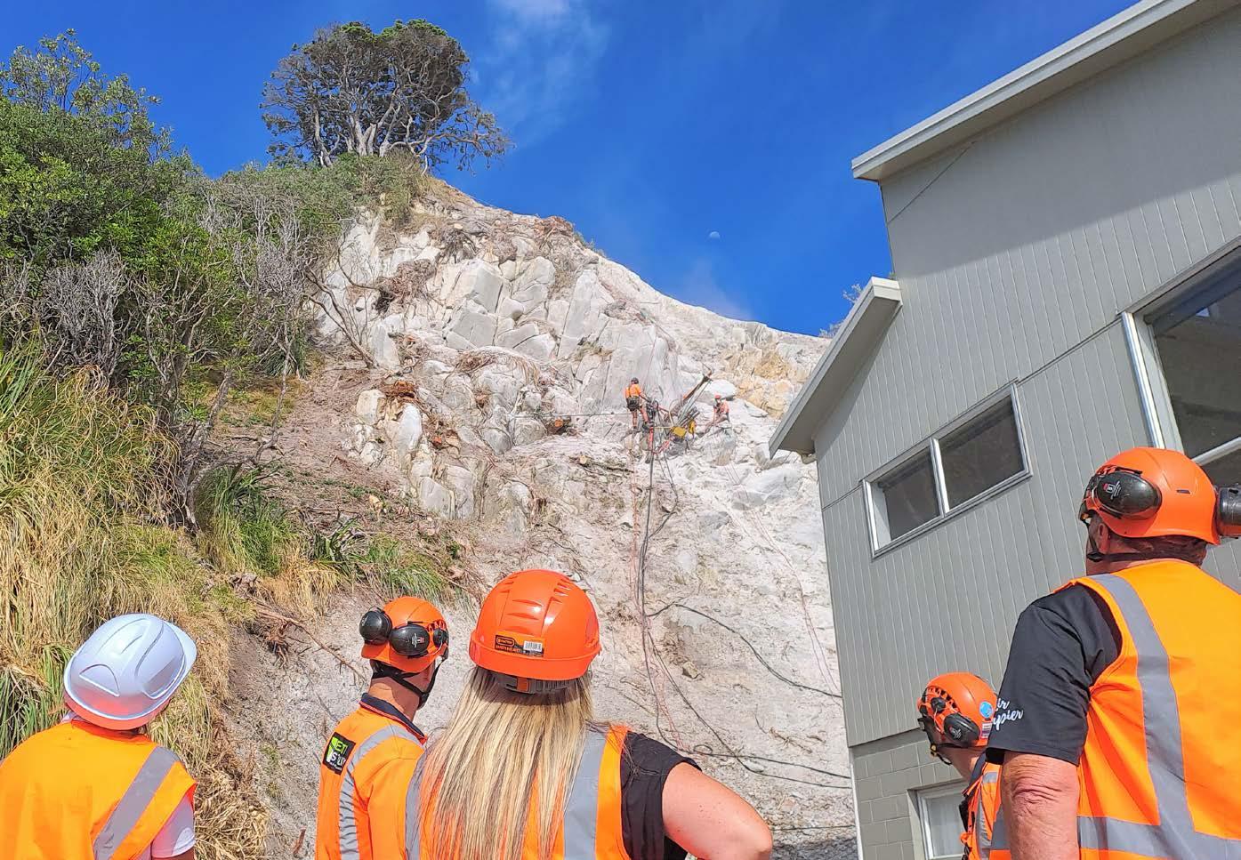 Over the next few months, across the white cliff face, two orange framed drill rigs held by cables and ropes will install 300 ‘rock bolts’ –