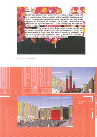 Color El color está utilizado bajo su función señalética en la primera parte de la revista, cada nota o sección utiliza un color (la elección del mismo corresponde a decisiones estéticas) de fondo, dividiendo la página en diferentes rectángulos que a su vez permiten la diagramación de algunos elementos. Estos rectángulos de color dinamizan la página. En la segunda parte de la revista el color es utilizado en títulos, pequeños textos como pies de fotografías, notas, etc. En estos casos el color tiene una función estética y señalética. Todas las fotografías son impresas a color y debido a su cantidad y tamaño vuelven a la revista sumamente colorida.
