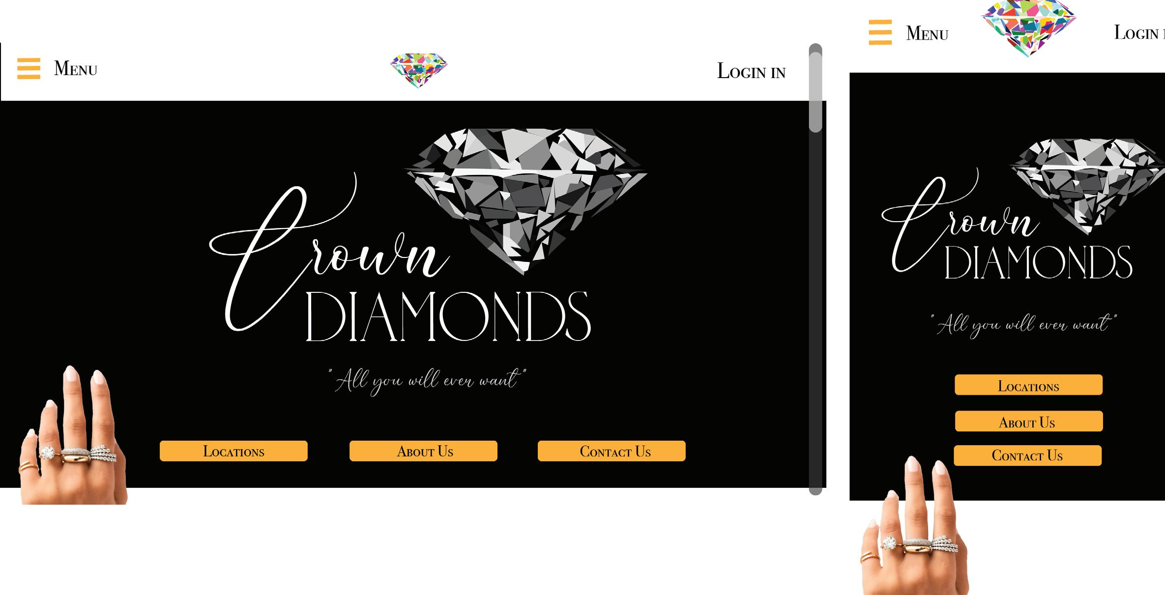 To match the style that I had envisioned for my diamond company, I wanted to create a stylish website and mobile application with minimalistic style and a color pallet to represent my company as a luxurious and trustworthy brand. I created it in Adobe Illustrator and Photoshop, but also added special elements like a Photoshop animation of the hand to make it more interactive.