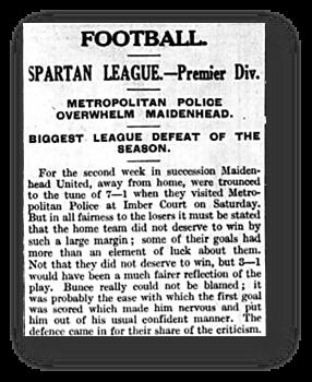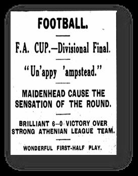 Goals from Basil Day and Jack Palethorpe put Maidenhead 2-0 up in the opening ten minutes; the same two players helped themselves to two more goals before the half-time break. The visitors made a determined effort to get back into the game in the second half but were unable to breach the home defence. Palethorpe completed his hat trick in the closing minutes before a Len Allum penalty saw United record a sensational 6-0 win, much to the delight of the majority of the 3,000 attendees Hampstead FC were renamed Golders Green four years later and in 1946 adopted their current name – Hendon FC
