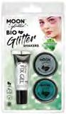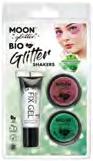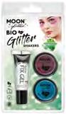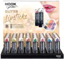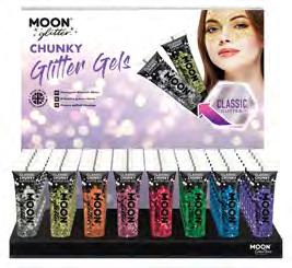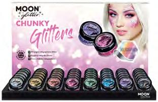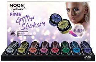 The display includes a balanced mix of cosmetic glitters, such as iridescent cosmetic glitter, fine and chunky glitter gels, biodegradable glitter and themed 3-packs.