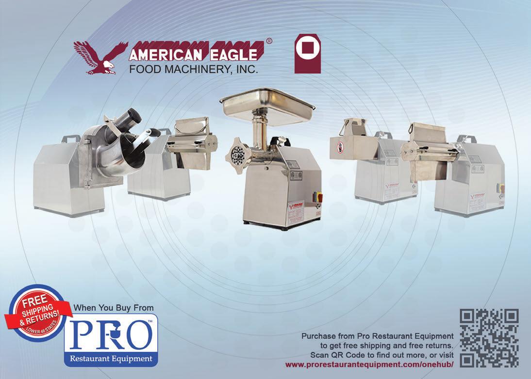 American Eagle Food Machinery. Our OneHUB Collection provides unmatched versatility! High-volume Meat Cutter Attachment (shown) cuts bigger pieces, features large 7”x2” feeder. The 1.5HP motor with #12 Hub powers 6 interchangeable attachments including meat grinder, tenderizer, cutter, jerky slicer, vegetable cutter. Process everything from beef, pork, chicken to vegetables and cheese with one countertop footprint. Save time and labor cost without hand-cutting! 800-386-5756; americaneaglemachine.com/onehub