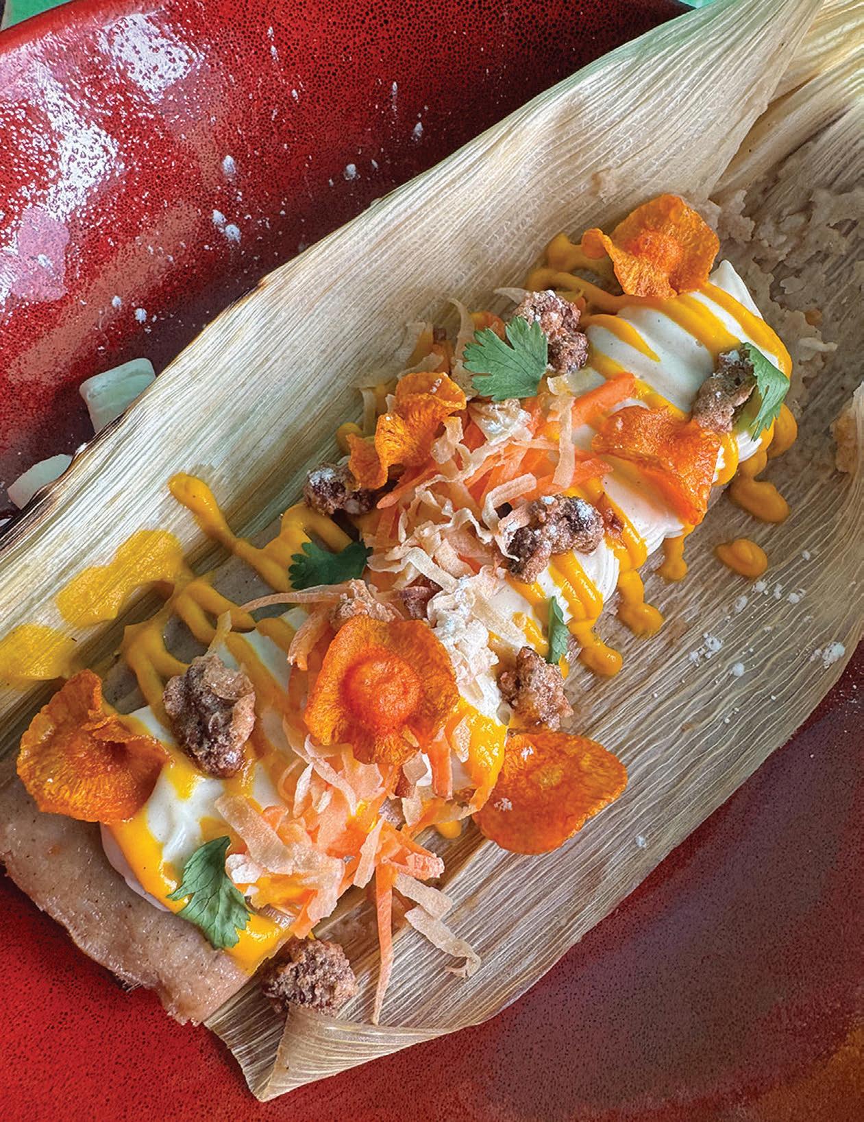The base of Holliday’s winning Smoky Oaxacan Charred Cucumber & Jobo Salsa resembles a mole. Key ingredients such as pepitas and garlic are mashed in a molcajete; toasted chiles, vinegar and oil deliver the unique salsa macha twist.