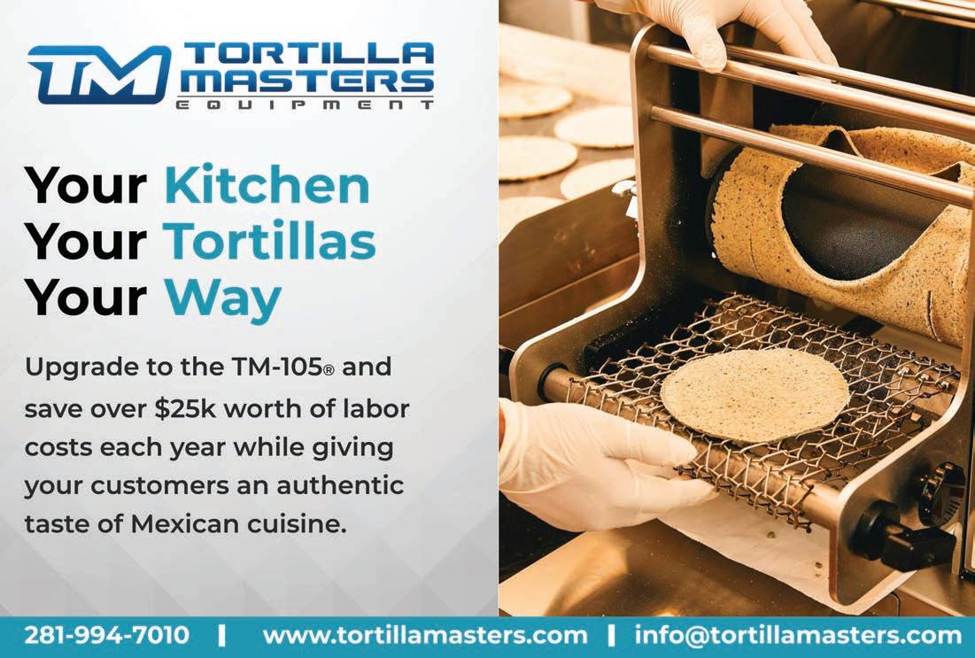 Tortilla Masters. Creating perfect, ready-to-cook corn tortillas has never been easier thanks to the Ventura Flex Corn Tortilla Machine — the first tabletop restaurant-style corn tortilla machine to meet UL and NSF standards. Convenient and small, with big production capabilities — makes up to 840 tortillas per hour. Can be placed on a table, occupying just 2 x 2 feet of space. Also available: Molino Masters Tabletop Corn Grinder, the first NSF and UL tabletop corn grinder restaurants can use to make masa; can produce up to 140 pounds of masa per hour and can be used with 7” x 3” grinding discs or volcanic stones. Made in the USA. 281-994-7010; tortillamachine.com