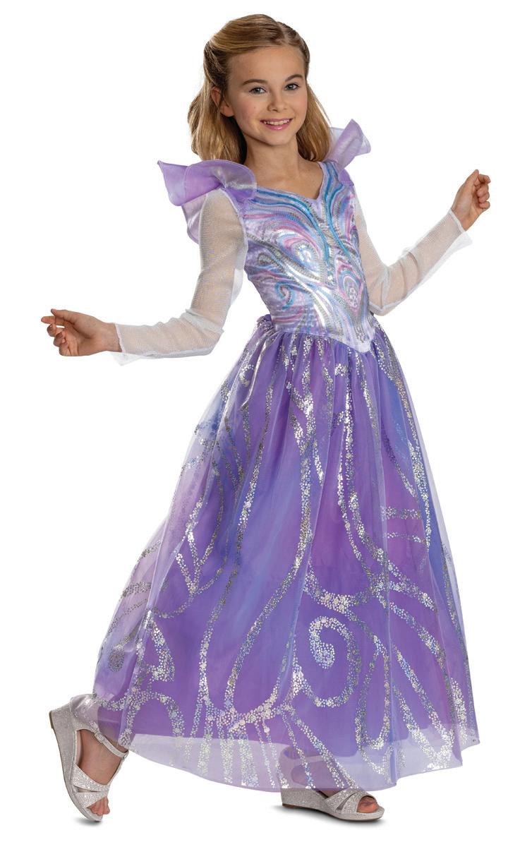 glinda for good deluxe c hild costume (173489) captures Glinda’s signature sparkle with a bodice in a purple/blue/pink swirl print; shimmering sequin trim; sheer silver sparkle sleeves; flutter shoulder; and full-length skirt with foil-printed butterfly wing outlines.