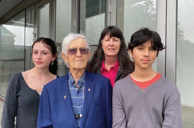 Standing outside the unfinished Karori Event Centre Isabella George (left) and Aun Hasnain (right) whose families have contributed to the centre, donor Gary Parsons and Heather Baldwin, the Chair of the Event Centre Trust. Photo: Supplied.
