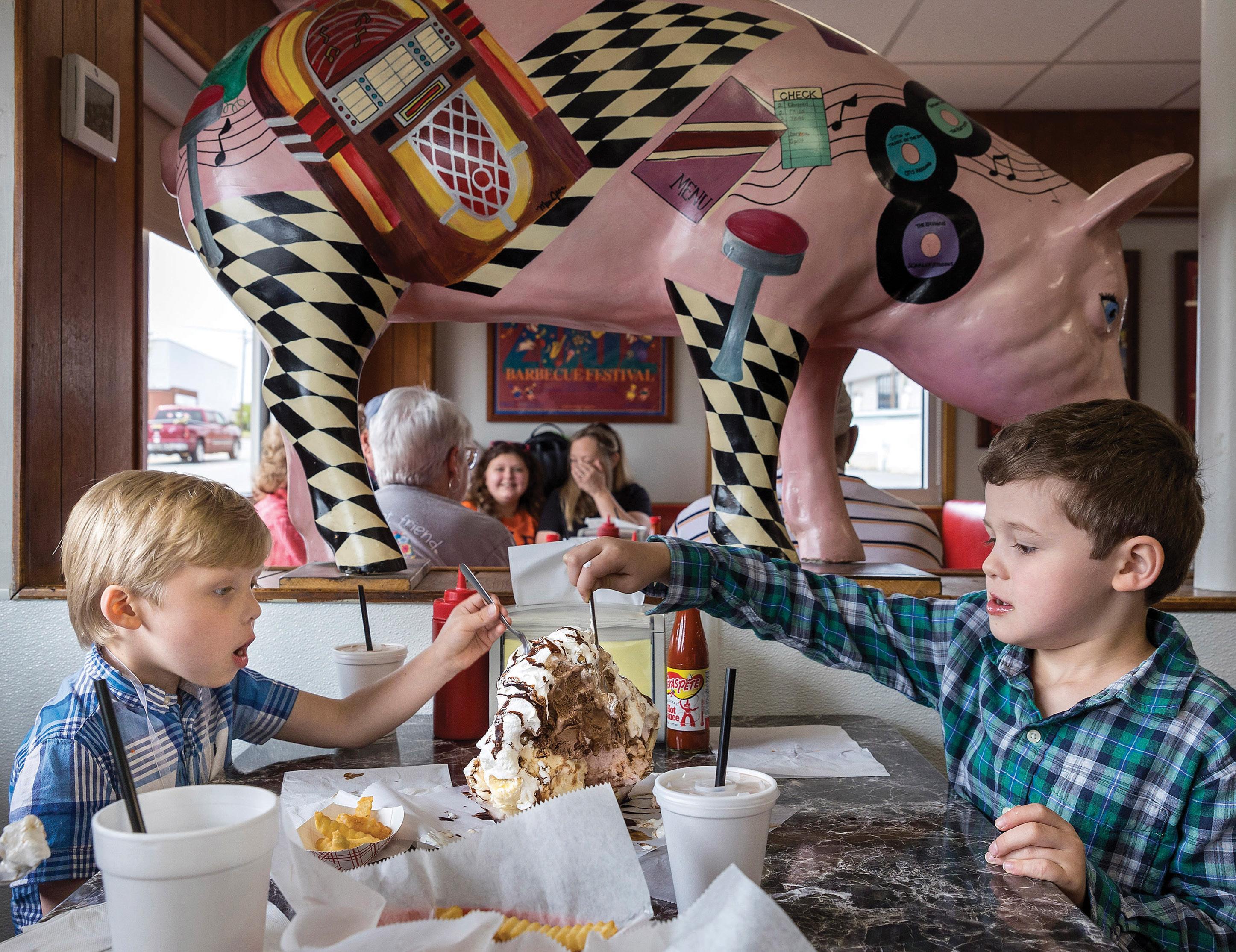 Lexington, NC, is known for its signaturestyle barbecue, but one of the town’s bestknown barbecue joints began as an ice cream shop. Bar-B-Q Center’s massive 4-pound banana split continues that heritage, much to the delight of local brothers Maverick and Pierce Clark, 4 and 7, who tackle the treat on Maverick’s birthday.
