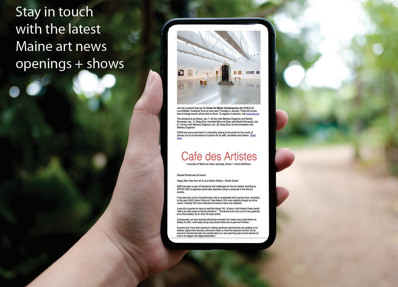 Our dynamic website and Cafe des Artistes blog and newsletter create a continuous drum beat and excitement for our clients’ openings, shows and news. Our website is fully mobile with powerful features that integrate clients and cafe postings, maps, cafe dates, and more. The Cafe des Artistes blog is recognized by many as Maine’s best art news. MG+SG advertisers get free Cafe publicity for their shows.