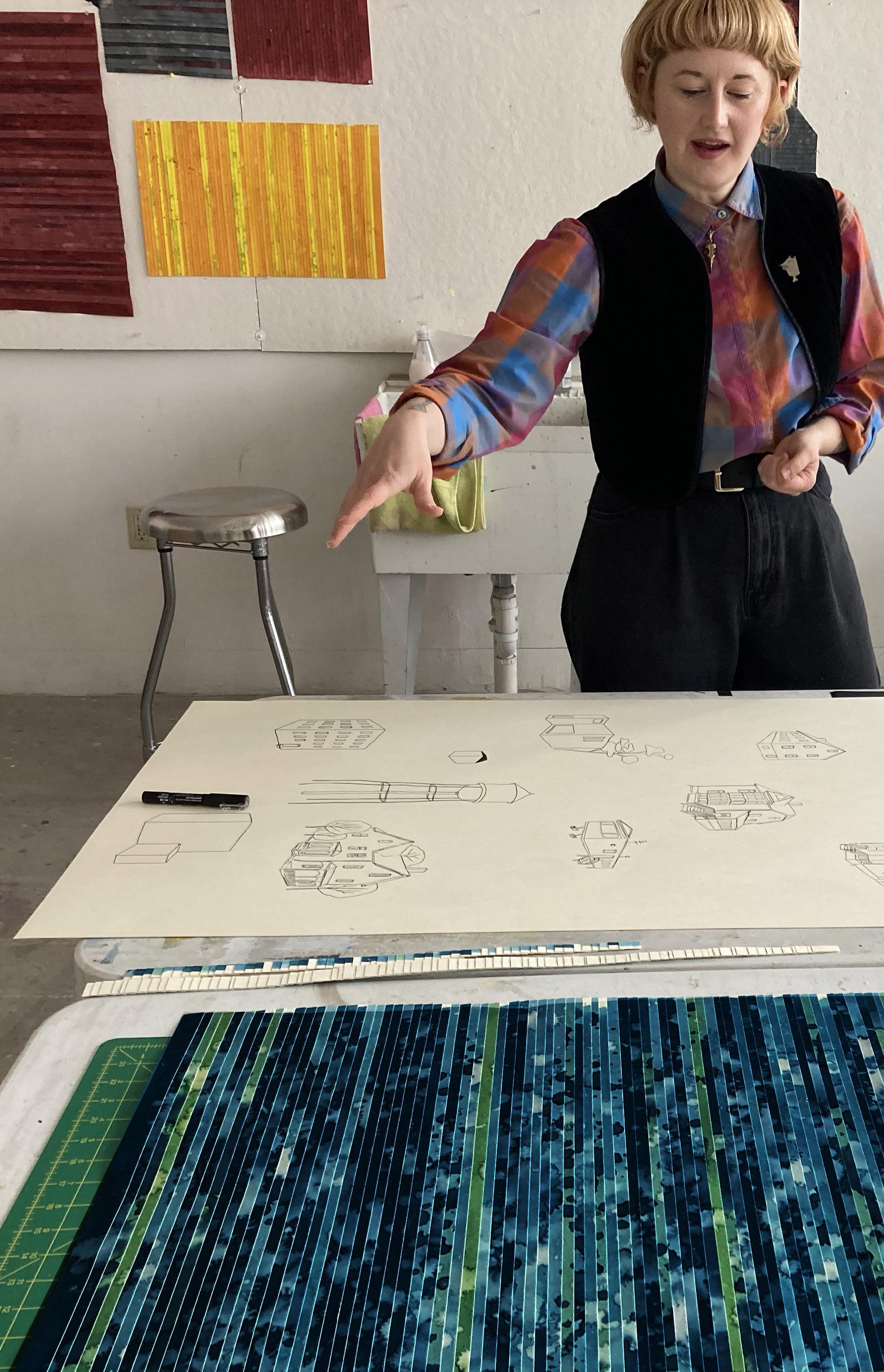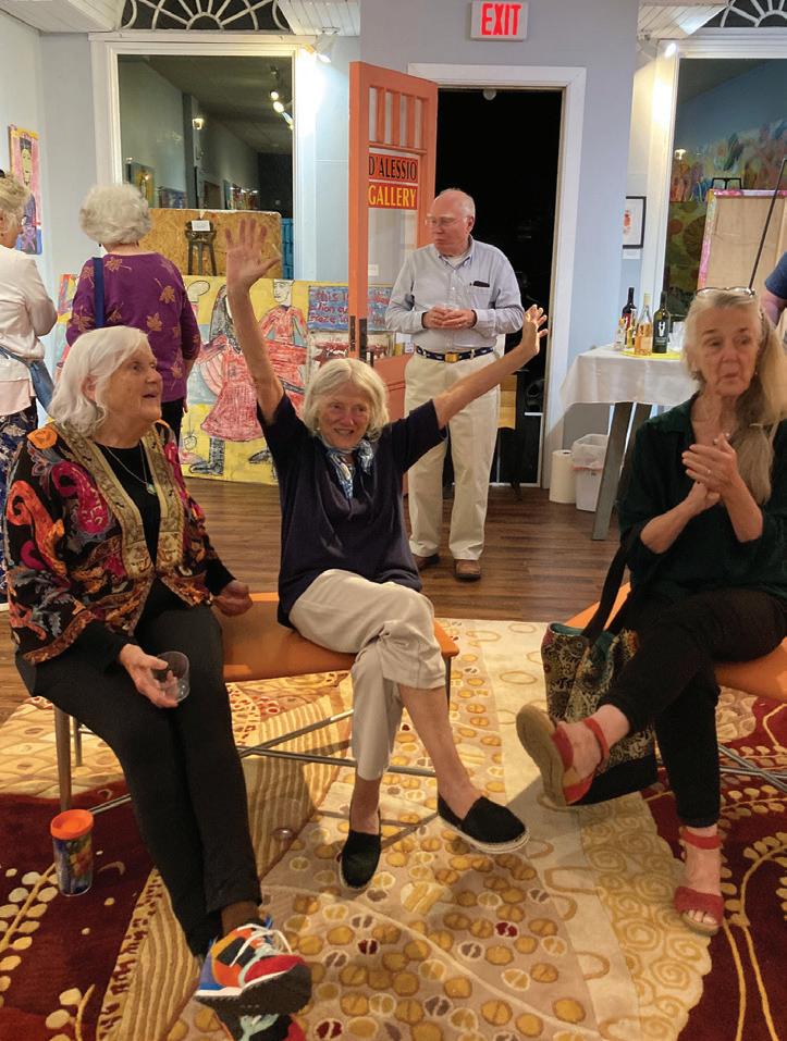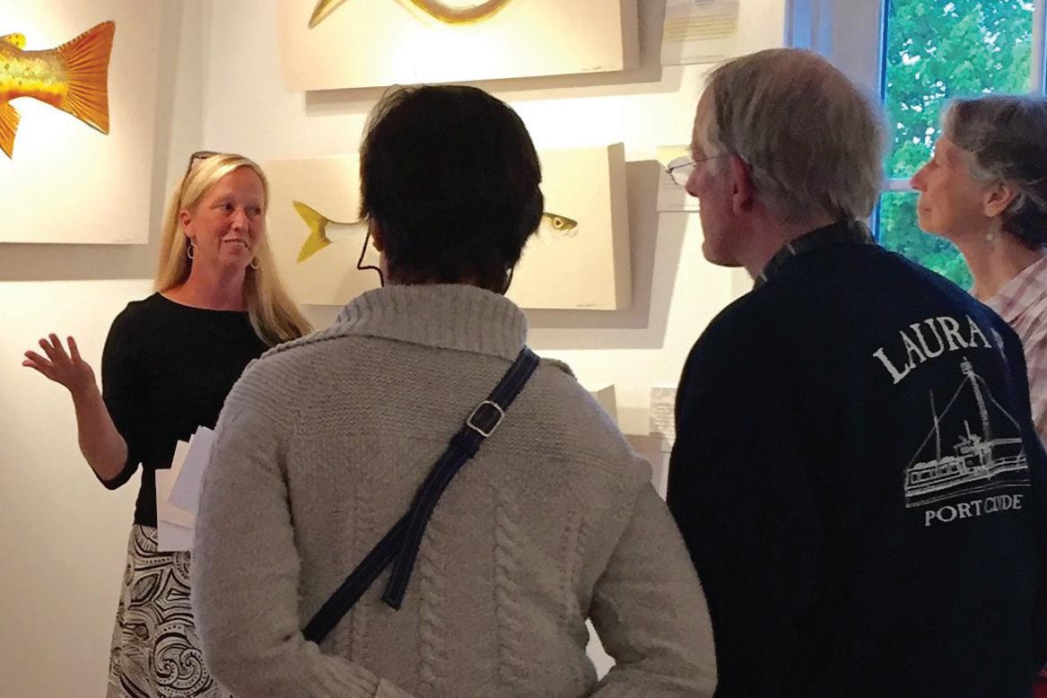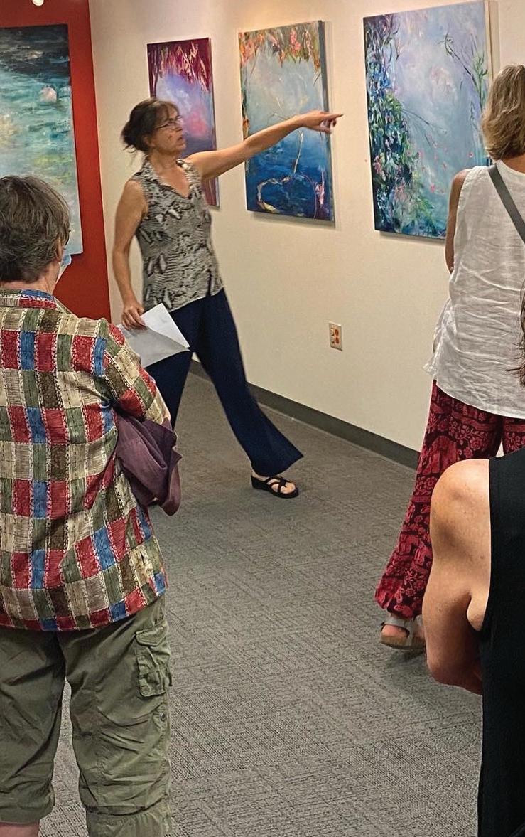 Joanne Tarlin is vice president of the Union of Maine Visual Artists (UMVA). Here she points to her art during a past artist talk at the former UMVA Gallery in Portland. The Portland chapter is seeking sponsors for a new exhibit space. This coming summer there will be a UMVA 50th Anniversary Members Show.
