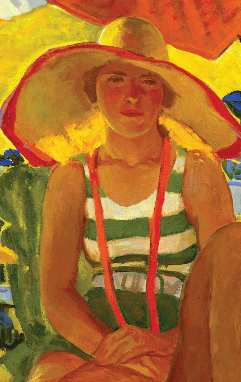 The cover painting Summer Sunlight (1936) depicts a domestic scene, likely painted while summering in Bartlett Harbor, North Haven. The painting depicts, from left to right, her neighbor, her eldest daughter, and her nephew against a backdrop of dunes and the ocean. The focus of the work, however, is the sunlight which strikes through the scene diagonally, lending a brilliant, penetrating warmth and shadow to the composition.