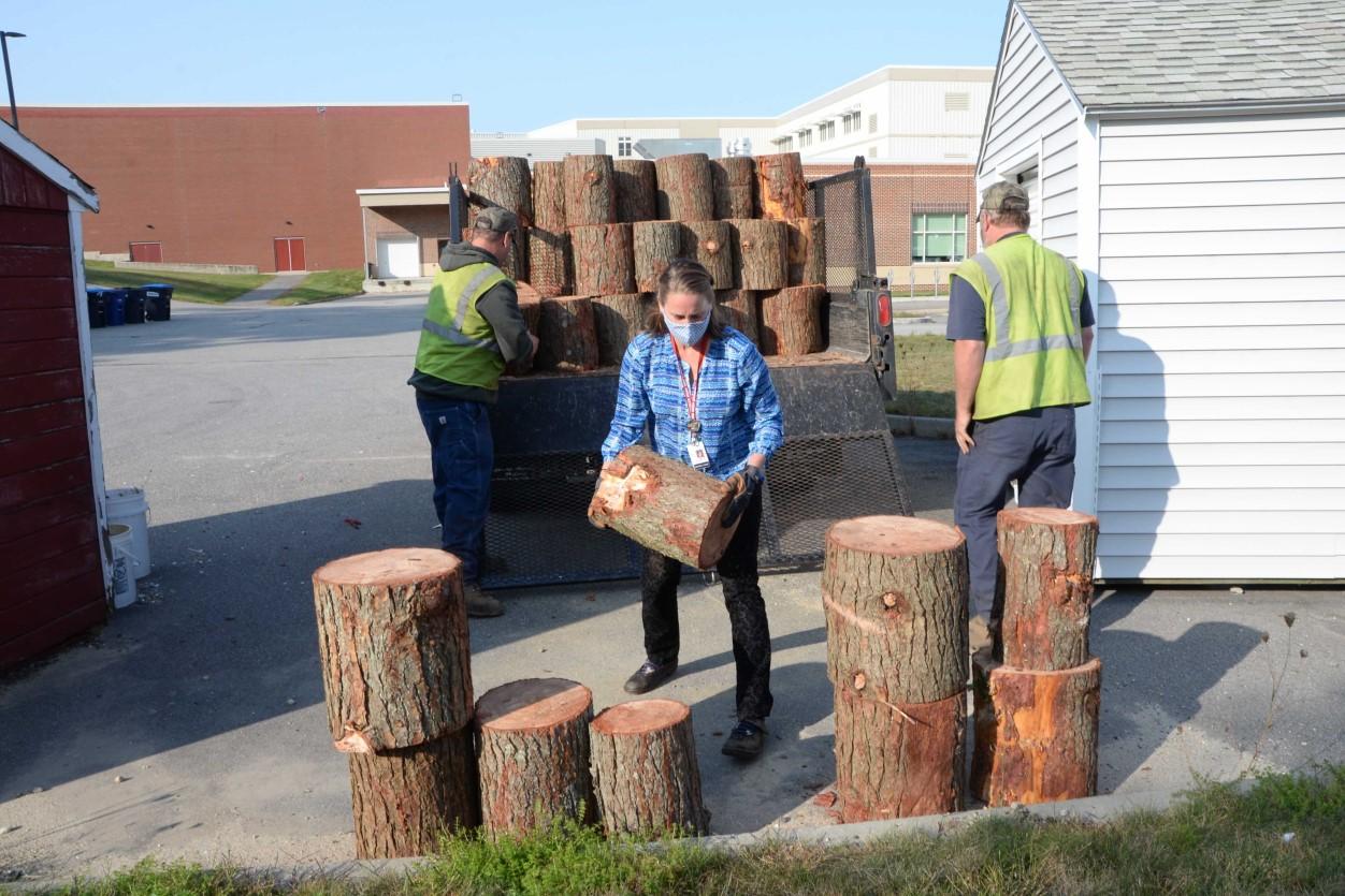 Early on the morning of Sept. 23, Richard Wing and employees sawed up hemlock logs donated by Phinney Lumber for the purpose into about 100 bucket-sized chunks to be used as outdoor seats, transporting them hours later to South Portland High School where McCloy met workers to unload them.