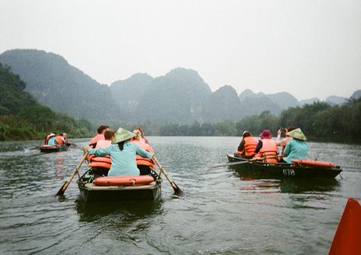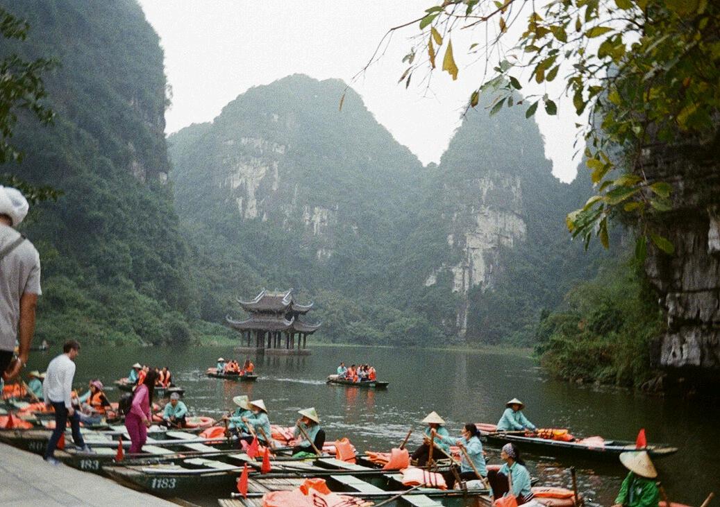 Taking a boat ride through the Trang An caves offers a breathtaking view of limestone grottoes lining the peaceful Sao Khe River. Women in conical hats row boats filled with tourists in bright orange life vests, creating a serene way to admire ancient local temples and marvel at the stunning rock formations and caves. Plus, youâll pass by the King Kong film set, adding an exciting cinematic touch to your journey.