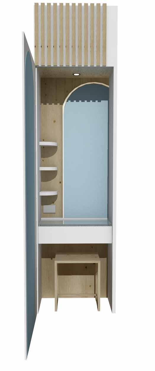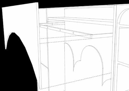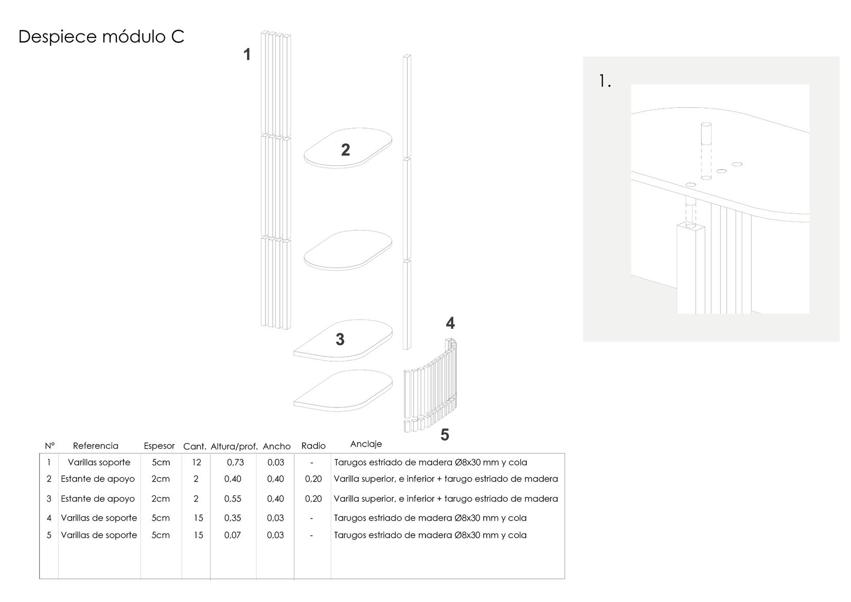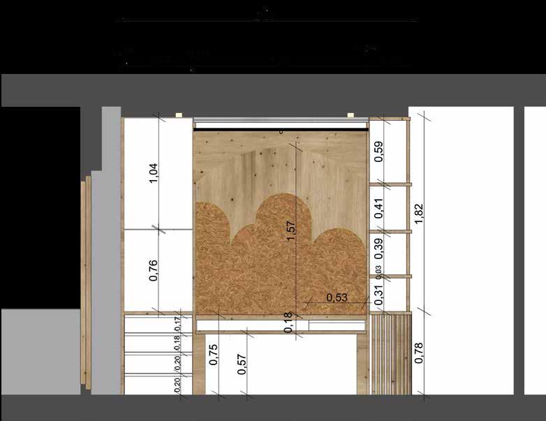 Partiendo de la medida de fenólico del mercado, utilizamos la técnica de basti dor tipo emparrillado para poder atorni llar los fenolicos y llegar a la medida seada. De este modo tambien se aligera la estructura evitando utilizar tableros macizos.