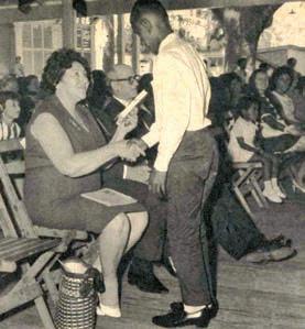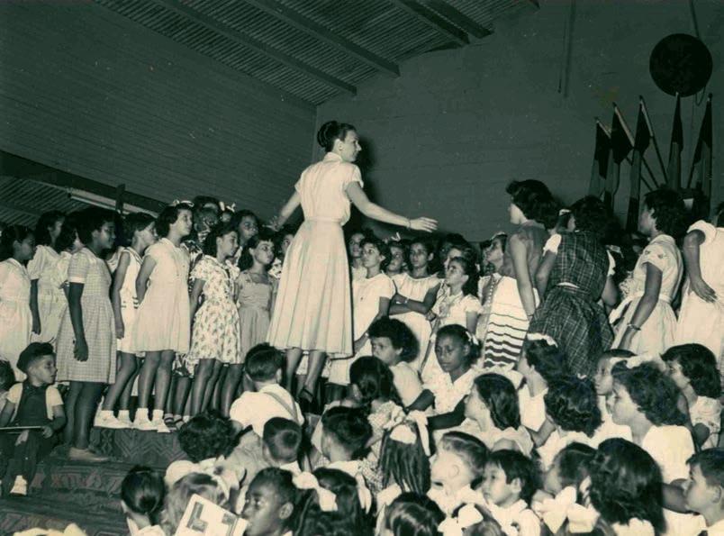 Madame Frogier, institutrice à l’école Suzanne Russier, faisant chanter ses élèves lors de la distribution des prix en déc. 1952, coll. Frogier