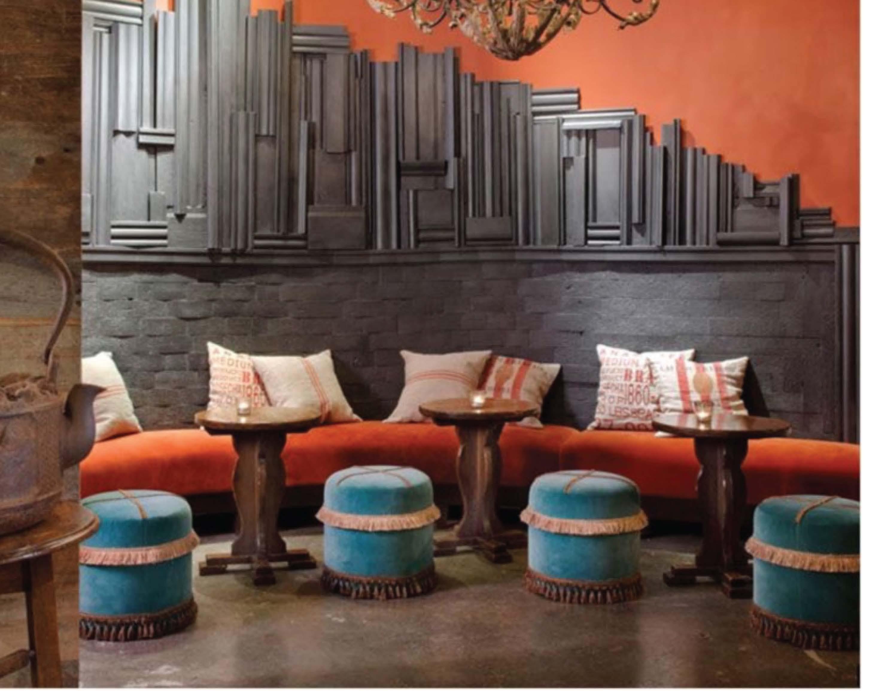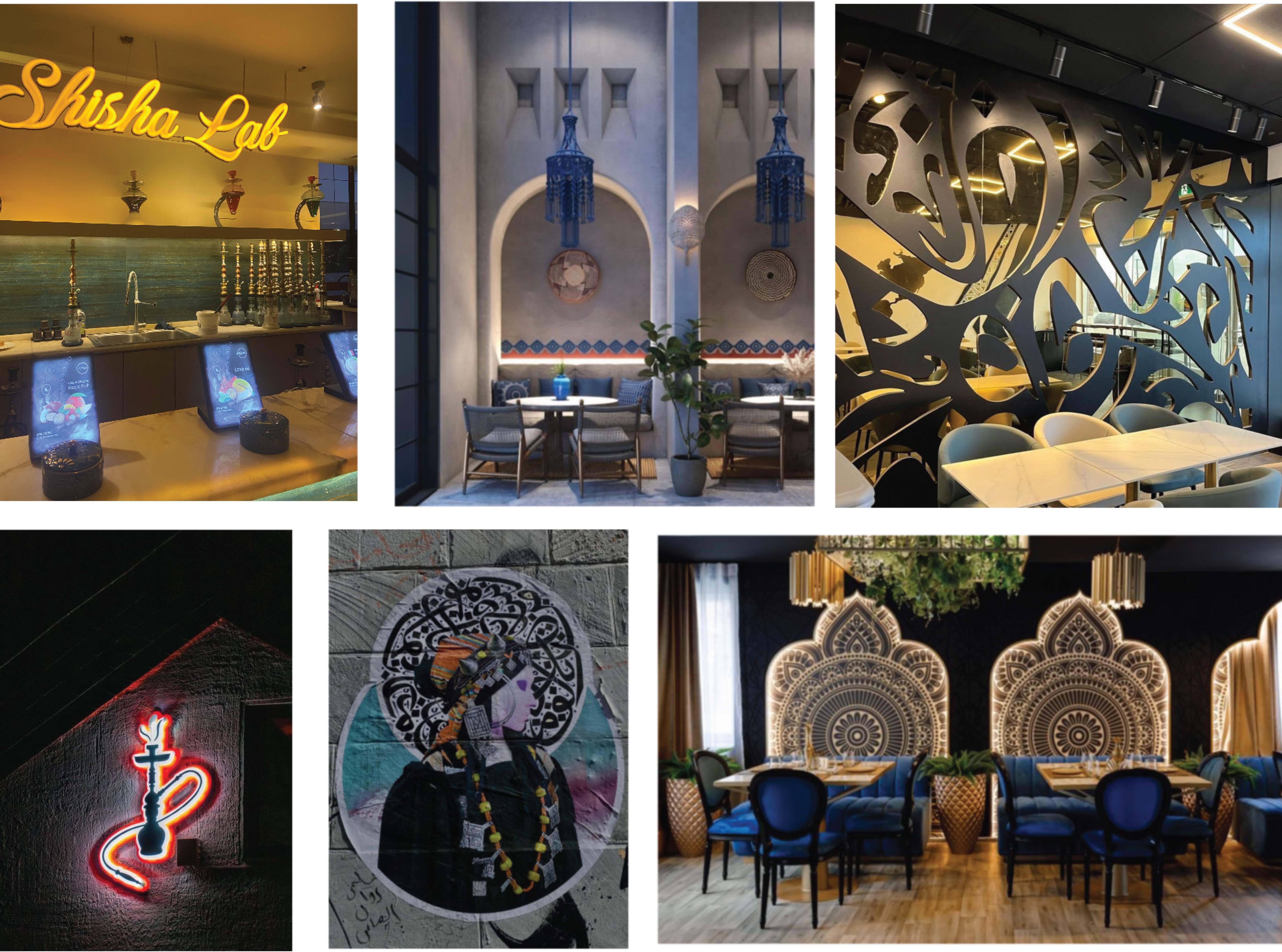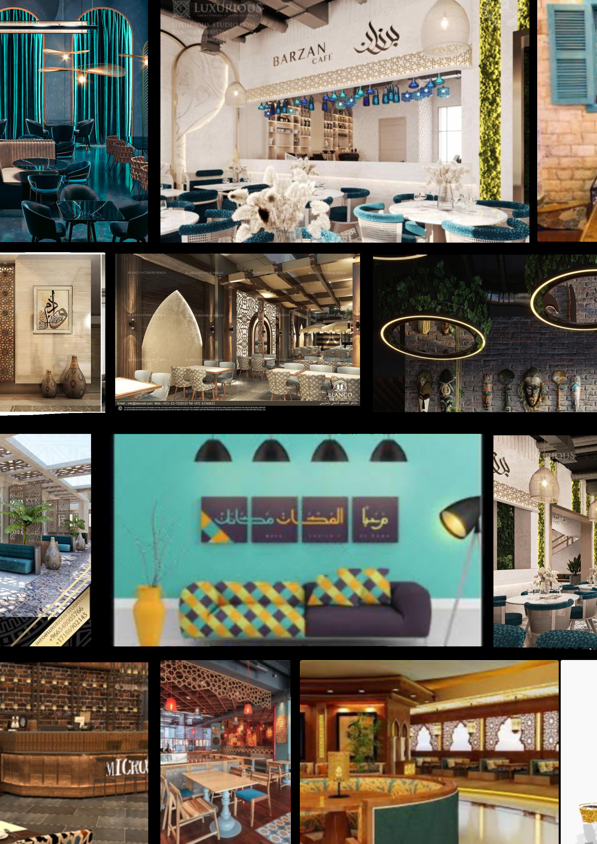 These are interior design project sketch proposals for a middle eastern Cafe that includes Hookah smoking. The client wanted bright, unique colors, highlighting royal blue. The mood boards combine inspiration for spaces that include royalty, arab, cozy, and modern minimalistic & bohemian styles. The orange serves as a complementary, powerful statement. Ornamentation, curved surfaces/ furniture, light colors given the small space, exposed HVAC system and high ceiling, given that there will be smoking, are the most important elements.