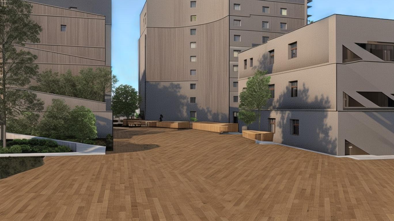 Prompt: landscape design, spacing trees, scale figures, wood benches, wood flooring or grass