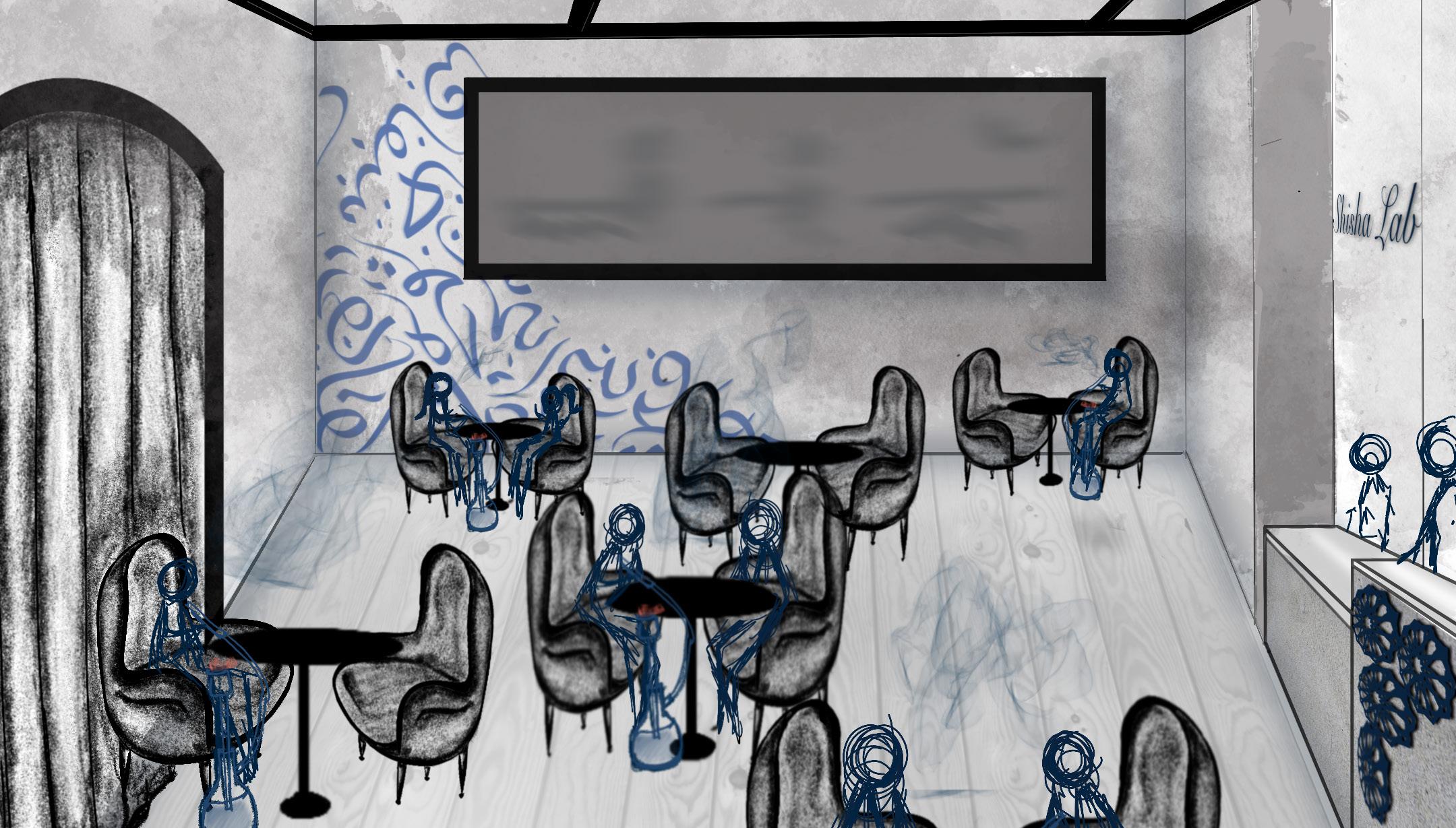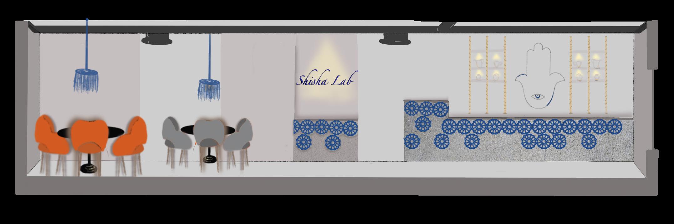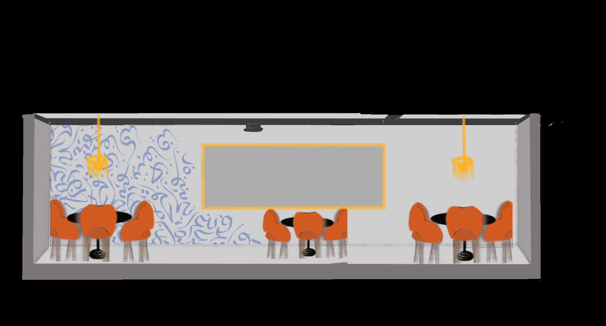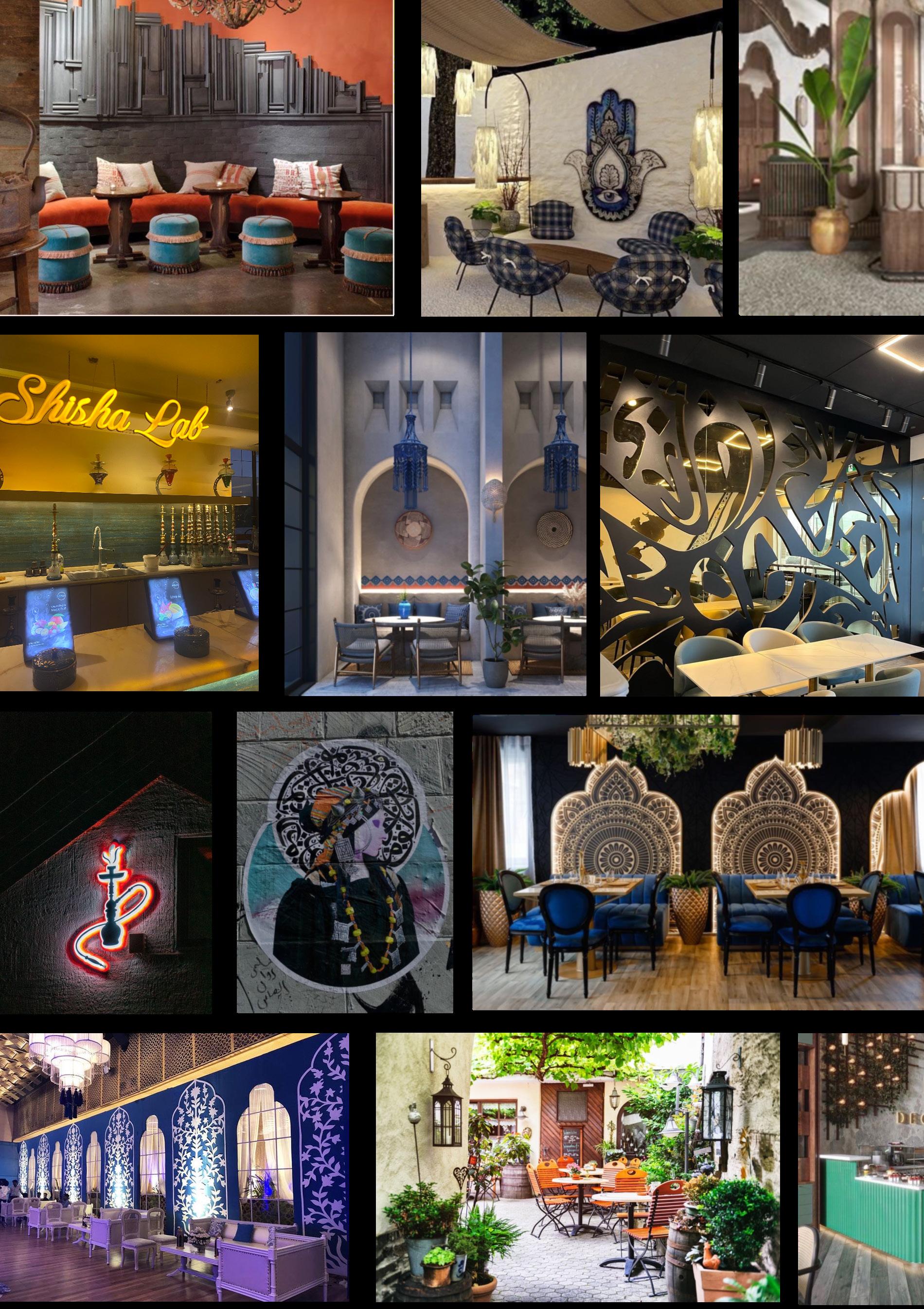 These are interior design project sketch proposals for a middle eastern Cafe that includes Hookah smoking. The client wanted bright, unique colors, highlighting royal blue. The mood boards combine inspiration for spaces that include royalty, arab, cozy, and modern minimalistic & bohemian styles. The orange serves as a complementary, powerful statement. Ornamentation, curved surfaces/ furniture, light colors given the small space, exposed HVAC system and high ceiling, given that there will be smoking, are the most important elements.
