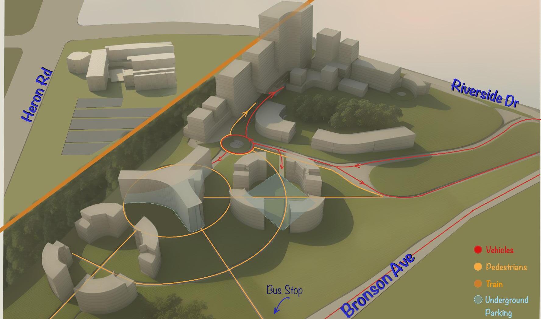 This project is an urban proposal of Confederation Heights. Inspired by David Fortin’s adaptive reuse of the American’s embassy in Ottawa project; this masterplan proposal also conceptually envelopes the existing structure; the CBC Building, symbolizing claiming the land back and also filling in the voids of the misinformation that is spread by mainstream media. The existing heritage building is assumed to be reused for housing.