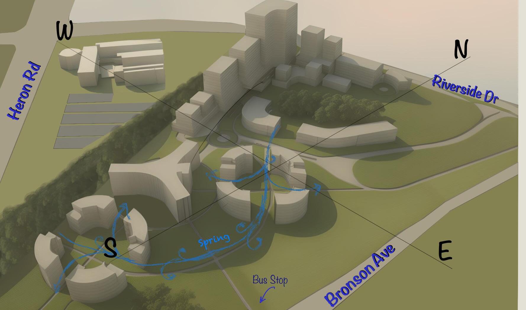 Given the close proximity to Carleton University, this project is mainly targeted towards students. The simple landscaping divides the open spaces allowing for more specific uses that can be curated by the inhabitants of each building.