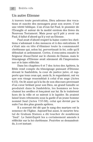 Un autre Etienne A travers toute persécution, Dieu adresse des vocations et suscite des messagers pour son œuvre. C’est une vérité biblique. L’un d’eux fut Paul, le pionnier de l’Evangile et auteur de la moitié environ des livres du Nouveau Testament. Mais pour qu’il pût y avoir un Paul, il fallut d’abord qu’il y eut un Etienne. Paul avait d’abord respiré la haine contre les chrétiens s’adonnant à des menaces et à des exécutions. Il s’était mis en tête d’éliminer toute la communauté chrétienne qui, selon lui, pervertissait la foi, celle qu’il défendait si ardemment. Certes, il rencontra ensuite le Seigneur Jésus-Christ sur le chemin de Damas, mais le témoignage d’Etienne avait sûrement dû l’impressionner et le faire réfléchir. Dans les chapitres 6 et 7 des Actes des Apôtres, la Bible rend compte du témoignage puissant d’Etienne devant le Sanhédrin, la cour de justice juive, et rapporte que tous ceux qui, assis là, le regardaient, ont vu que son visage ressemblait à celui d’un ange (Actes 6:15). On lit aussi qu’à la fin de son discours provenant d’un cœur brûlant pour son Dieu, un grand tumulte se produisit dans le Sanhédrin, les hommes se bouchaient les oreilles et fonçaient sur lui. Ils le traînèrent hors de la ville et se mirent à le lapider. Ils avaient laissé leurs vêtements sous la garde d’un jeune homme nommé Saul (Actes 7:57-58), celui qui devint par la suite l’un des plus grands apôtres. Il a souvent été dit que le sang des martyrs est la semence de l’Eglise. Aujourd’hui aussi, le meurtre brutal de Graham Staines a dû toucher de nombreux "Saul". Le Saint-Esprit les a certainement amenés à réfléchir sur la foi chrétienne. Peut-être se demandentils, à cet instant: