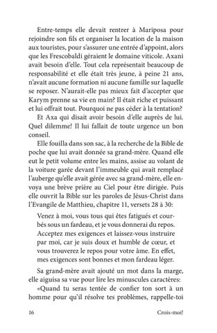 Entre-temps elle devait rentrer à Mariposa pour rejoindre son fils et organiser la location de la maison aux touristes, pour s’assurer une entrée d’appoint, alors que les Frescobaldi géraient le domaine viticole. Axani avait besoin d’elle. Tout cela représentait beaucoup de responsabilité et elle était très jeune, à peine 21 ans, n’avait aucune formation ni aucune famille sur laquelle se reposer. N’aurait-elle pas mieux fait d’accepter que Karym prenne sa vie en main? Il était riche et puissant et lui offrait tout. Pourquoi ne pas céder à la tentation? Et Axa qui disait avoir besoin d’elle auprès de lui. Quel dilemme! Il lui fallait de toute urgence un bon conseil. Elle fouilla dans son sac, à la recherche de la Bible de poche que lui avait donnée sa grand-mère. Quand elle eut le petit volume entre les mains, assise au volant de la voiture garée devant l’immeuble qui avait remplacé l’auberge qu’elle avait gérée avec sa grand-mère, elle envoya une brève prière au Ciel pour être dirigée. Puis elle ouvrit la Bible sur les paroles de Jésus-Christ dans l’Evangile de Matthieu, chapitre 11, versets 28 à 30: Venez à moi, vous tous qui êtes fatigués et courbés sous un fardeau, et je vous donnerai du repos. Acceptez mes exigences et laissez-vous instruire par moi, car je suis doux et humble de cœur, et vous trouverez le repos pour votre âme. En effet, mes exigences sont bonnes et mon fardeau léger. Sa grand-mère avait ajouté un mot dans la marge, elle aiguisa sa vue pour lire les minuscules caractères: «Quand tu seras tentée de confier ton sort à un homme pour qu’il résolve tes problèmes, rappelle-toi 16