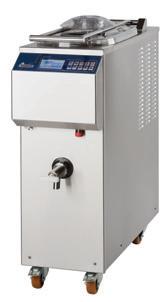 Bain-marie heating with continuous blending of the liquids. This, together with the PLC-controlled resistance heating devices, gives fine-texture and accuracy in production even at the 30% of the machine production rates, without burning the mix or the machine side panels.