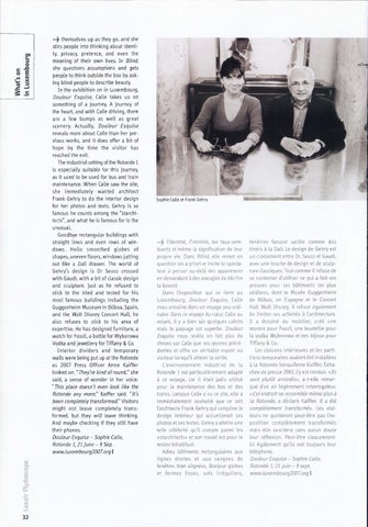 stirs people into thinking about identi ty, privacy, pretence, and even the meaning of their own lives. In Blind, she questions assumptions and gets people to think outside the box by ask ing blind people to describe beauty. In the exhibition on in Luxembourg, Douleur Exquise, Calle takes us on something of a journey. A journey of the heart, and with Calle driving, there are a few bumps as w ell as great scenery. Actually, D ouleur E xq u ise reveals more about Calle than her pre vious works, and it does offer a bit of hope by the time the visitor has reached the exit. The industrial setting of the Rotonde 1 is especially suitable for this journey, as it used to be used for bus and train maintenance. When Calle saw the site, she