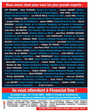 Ils vous attendent à Financial One ! Bruxelles Expo, 12-13 mai 2004 : 4500 m2 d'expo et conférences Entrée gratuite, réservée aux professionnels, inscrivez-vous sur www.financialone.be THE WALL STREET JOURNAL EUROPE • DATANEWS • FCI • STANDARD & POOR'S • SOLVAY BUSINESS JOURNAL • DER AKTIONÄR • BFM • MORNINGSTAR • BANCO • GESTION DE FORTUNE • INFINANCE • RISK • BANQUE & INFORMATIQUE • BANKING & FINANCE • PME-KMO • ASSET MANAGEMENT MAGAZINE • EUROMONEY • ECO MAGAZINE • L'ECHO • LA VIE FINANCIERE • EUROSCRIPT • LES ECHOS •