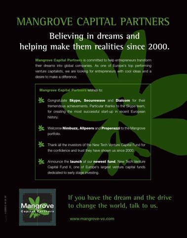 Mangrove Capital Partners wishes to: Congratulate Skype, Securewave and Dialcom for their tremendous achievements. Particular thanks to the Skype team, for creating the most successful start-up in recent European history. Welcome Nimbuzz, Allpeers and Properazzi to the Mangrove portfolio. Thank all the investors of the New Tech Venture Capital Fund for the confidence and trust they have shown us since 2000. Announce the launch of our newest fund, New Tech Venture Capital Fund II, one of Europe's largest venture capital funds