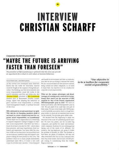 and health to environment and time accommodation. But we are not trying to reinvent the wheel. We are convinced there are best practices already being carried out within companies, so we need to share that. Our objective is to be a toolbox for corporate social responsibility. What are the unique advantages and disadvantages of creating such a network in Luxembourg? How much was the structure of IMS inspired by that of the French organisation IMS-Entreprendre pour la Cité? “We have no formal association with IMS-Entreprendre pour la Cité. We just asked if we could take over part of their name. We have closer links with CSR Europe, a sort of umbrella association which is a huge European toolbox to which all our members have access via the internet. This provides great added value. We decided from the beginning to adapt our structure to the scale of Luxembourg and its market. We have two pillars, one for so-called big companies, and another for small- and mediumsized companies. Each has its own working group taking care of the needs of its affiliates. For instance, the big employers are going to tackle the problem of mobility in 2009. The problem is that there are plenty of initiatives, but they are often restricted to the city, or, if on a national scale, they stop at the border. And we have 150,000 people coming to Luxembourg from the Greater } 98 Region every day. paperjam | Mai 2009 | management