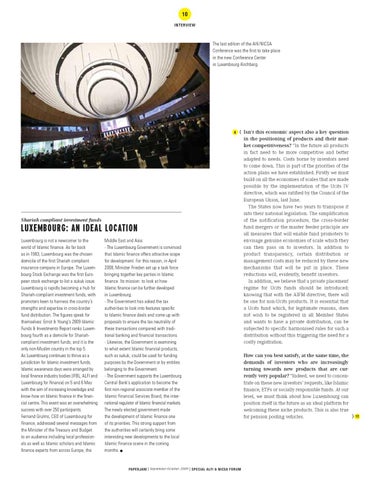 in the positioning of products and their market competitiveness? “In the future all products in fact need to be more competitive and better adapted to needs. Costs borne by investors need to come down. This is part of the priorities of the action plans we have established. Firstly we must build on all the economies of scales that are made possible by the implementation of the Ucits IV directive, which was ratified by the Council of the European Union, last June. The States now have two years to transpose it into their national legislation. The simplification of the notification procedure, the cross-border fund mergers or the master feeder principle are all measures that will enable fund promoters to envisage genuine economies of scale which they can then pass on to investors. In addition to product transparency, certain distribution or management costs may be reduced by these new mechanisms that will be put in place. These reductions will, evidently, benefit investors. In addition, we believe that a private placement regime for Ucits funds should be introduced; knowing that with the AIFM directive, there will be one for non-Ucits products. It is essential that a Ucits fund which, for legitimate reasons, does not wish to be registered in all Member States and wants to have a private distribution, can be subjected to specific harmonised rules for such a distribution without this triggering the need for a costly registration. How can you best satisfy, at the same time, the demands of investors who are increasingly turning towards new products that are currently very popular? “Indeed, we need to concentrate on these new investors’ requests, like Islamic finance, ETFs or socially responsible funds. At our level, we must think about how Luxembourg can position itself in the future as an ideal platform for welcoming these niche products. This is also true } 12 for pension pooling vehicles.