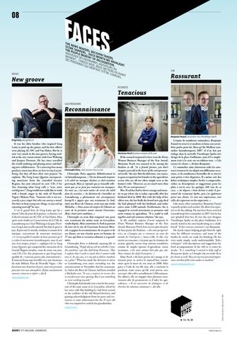 It was his elder brother who inspired Greg Lamy to pick up the guitar, and his first efforts were playing AC/DC and Van Halen. But he is now very much in the jazz groove, having studied at the city conservatoire with Gast Waltzing and Jacques Pirotton. He has since travelled the world studying and playing music and finding new collaborators. “It is amazing how many good jazz musicians there are here in tiny Luxem bourg, but they all have their own projects,” he explains. The Greg Lamy Quartet, incorporating musicians from the extended Greater Region, has just released its new CD, I See You, featuring what Greg calls a “new, more world groove”. Greg would now really like to work with a female singer in the style of Nouvelle Vague’s Melanie Pain. “Someone who is not necessarily a jazz singer but who can convey a mood. You have to keep trying new things, or you end up repeating yourself,” he says. C’est le grand frère de Greg Lamy qui lui a donné l’idée de jouer de la guitare ; ce dernier s’est d’abord entraîné sur AC/DC et Van Halen. Mais après avoir étudié au Conservatoire de la Ville de Luxembourg avec Gast Waltzing et Jacques Pirotton, Greg Lamy excelle aujourd’hui dans le groove jazz. Il parcourt le monde, étudiant et jouant de la musique, rencontrant de nouveaux musiciens. « C’est incroyable le nombre de bons jazzmen qu’il y a dans le microcosme luxembourgeois, mais ils ont tous leurs propres projets », explique-t-il. Le Greg Lamy Quartet, qui comprend des musiciens de la Grande Région étendue, vient de sortir son nouveau CD, I See You, proposant ce que Greg Lamy qualifie de « nouveau groove plus international ». Il aimerait beaucoup travailler avec une chanteuse du style Mélanie Pain de Nouvelle Vague. « Pas forcément une chanteuse de jazz, mais une personne pouvant créer une atmosphère. Il faut constamment innover, sinon on se répète », dit-il. www.greglamy.com