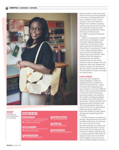 LOCAL FABLES Like many other designers, Sophie Dewalque, creator of Sophi(e)stication, couldn’t find what she was looking for. “I grew frustrated with recognising the same products in so many different stores, many coming from factories in Asia that weren’t necessarily prioritising quality over quantity,” she explains. Dewalque’s designs are playful and soulful children’s accessories. Taking inspiration from movies like Marie Antoinette and The Grand Budapest Hotel, her shop is more of a ‘by appointment’ showroom where parents can come with children to play, explore and discover something perfect for them. The focus stays on Luxembourg though, using characters from local fairytales and stories, her soft toys are iconic and one of a kind. Her latest accessory is a black and white textile book which is screen printed and can be coloured in for interactive reading. Inspired by the Luxembourg fable D’Maus Ketti by Auguste Liesch, she is one of the many designers who are waving their Luxembourg flags with pride.