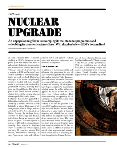 NUCLEAR UPGRADE An unpopular neighbour is revamping its maintenance programme and redoubling its communications efforts. Will the plan bolster EDF’s bottom line? Text: Aaron Grunwald — Photos: Olivier Minaire