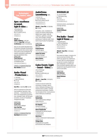 AudioVision Luxembourg SARL 15 Dernier Sol L-2543 Luxembourg T 49 55 49 55, F 49 55 49 56 www.audiovision.lu info@audiovision.lu Effectif: 18 Euro TVA: LU 17361969 RC: B 62861 Conception, vente, installation et location de solutions audiovisuelles. Matériel pour congrès, salles de conférence, auditoires, visioconférence, murs d’images, éclairage architectural. Production vidéo. Distribution Sony Pro,Bose Pro,Digidesign.