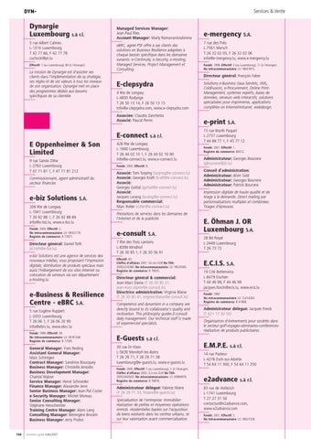 e-Business & Resilience Centre - eBRC S.A. 5 rue Eugène Ruppert L-2453 Luxembourg T 26 06 1, F 26 06 20 90 info@ebrc.lu, www.ebrc.lu Fondé: 1999. Effectif: 39. No intracommunautaire: LU 18187346. Registre de commerce: B 72585.