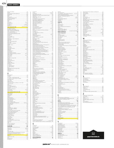 SG Group SA 118 SGG SA 41, 115, 116 SGI, Ingénierie 261, 267 Shahin Tadauony (ep. Thon) 255 Shipowners’ Mutual Strike Insurance Association Europe 58 Shoja Micheli 252 Shopping Center Belle Etoile 74 Showtime SARL 306 SIA, Société Internationale d’Architecture 254 Siaci & Partners Luxembourg SA 64 Siegel Schleimer Ingénieurs-Conseils 261 Siegle-Christophory Architectes 254, 267 Sigelux Bureau Immobilier SA 239 Sigma Conso Luxembourg SA 101, 174 Silicon DNA SA 175 Simac PSF SA 167 Simin Mollaian 252 Simon & Christiansen 261 Simone Bispinck (ep. Hamacher) 246 Simone Poeckes Architecte 254, 267 Simtech 261 Sit-Lux, Société d’Ingénierie Technique Luxembourg 261 Sit-Net SA 181 Sita Software SA 175 SJLC | Sedlo Jimenez Lunz Clement 131 SK Immobilière 239 Skill Lab SARL 199, 201 SkillTeam Luxembourg SA 187 Sky Broadband SA 189 Skycom – Telematics Systems SARL 175 Skype SA 168 Skyr Consultants SARL 155 Smalux SARL 74 Smart Private Managers 41 Snapshot Web Design SARL 189 SNCT, Société Nationale de Contrôle Technique SA 287 Société Civile 35 Société Coopérative 53 Société d’Assistance Informatique Luxembourgeoise SA 187 Société de Gestion Fiduciaire SARL 118 Société de la Bourse de Luxembourg SA 41 Société de Transports Internationaux - SOTRAI SARL 230 Société Électrique de l’Our – SEO SA 93 Société Générale Bank & Trust – SGBT SA 32 Société Générale Securities Services Luxembourg SA 41 Société Luxembourgeoise Chanzy-Pardoux SARL 86 Société Luxembourgeoise de Capital-Développement pour les PME (CD-PME) SA 106 Société Luxembourgeoise de Surveillance 268 Société Nationale de Crédit et d’Investissement – SNCI 106 Socom SA 74 Socotec Luxembourg SARL 86 Sodexo 156 Sofitel Luxembourg Le Grand Ducal SA 210 SOFTEC SA 188 Software AG (IDS Scheer) Luxembourg SA 173 Software AG Belux SA 175 Sogecore International SA 64 Sogecore SA 64 Sogedec 254, 262 Sogelife SA 63 Sogéroute SARL 87 Sogeti SA 184 Solana Architecture 254 Soler 90 Soludec (Société Luxembourgeoise d’Entreprises et de Constructions) SA 86 Solum Real Estate SA 243 Soluprint SA 181 Sopra Banking Software Luxembourg SA 44, 171 SOS Sahel International Luxembourg ASBL 299 SOS Villages d’Enfants Monde ASBL 299 Sources Rosport SA 79 Spaceplus SARL 239 Spanworx 262 Sparinvest SA 53 Sqope SA 105 Stadtbredimus 282 Stanislaw Berbec 246 Starwood Capital Group European SARL 53 State Street Bank Luxembourg SA 35 Statec – Institut National de la Statistique et des Études Économiques 287 Station Immo SA 239 StatPro Benelux SA 171 Stdm, Steinmetzdemeyer 255, 267 Stefan Zimmer 262 Steffen Jean-Claude 119 Steffen Traiteur SARL 206 Steinfort 282 Steinsel 282 Stephan Hain 249 Stephan Poth 261 Stephanie Laruade 251 Steria PSF Luxembourg SA 185 Stibbe Luxembourg 131 Stimulus SARL 160 Sting SA 106 Stintec Luxembourg 262 Strassen 282 Stratego Trust SA 41 Strategy builders 102 Studio 88 255 Studio Concept 255 Studio E 255, 262 Studio Fränk Weber Entreprise Individuelle 199 Studio Sncda 255 Studio3 197 Stugalux Construction SA 86 Sudstroum SECS 90 SunGard Availability Services SA 178 SunGard Systems Luxembourg SA 47, 49, 171 SuperDrecksKëscht SA 74 Sustain SA 105 Swiss Life (Luxembourg) SA 56, 63 Swiss Life Assurances Solutions (SLAS) 63 Swiss Life International Pension Fund 63 Sylvain Garnier 249 Sylvain Monteiro 263 Sylvain Popoff 253 Syndicat National des Enseignants SNE/CGFP 300 Syndikat Erzéiung a Wëssenschaft am OGB-L – SEW 300 Syntec 262 SyrKus 304 System Solutions Luxembourg SA 165 Systemat Luxembourg PSF SA 47, 49, 173, 184 Syvicol – Syndicat des Villes et Communes Luxembourgeoises 298