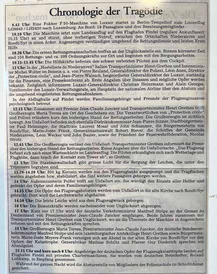 Die Unglücksmaschine, eine Fokker F 50 der Luxair, war um 8.43 Uhr vom Berliner Flughafen Tempelhof gestartet und hätte um 10.15 Uhr in Luxemburg landen sollen. Gegen 10.10 Uhr stürzte sie, während sie eine Warteschleife flog, zwischen den Ortschaften Niederanven und Roodt/Syr in einem Acker ab. An Bord waren 19 Passagiere und 3 Besatzungsmitglieder.