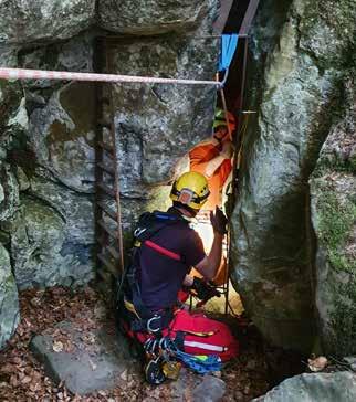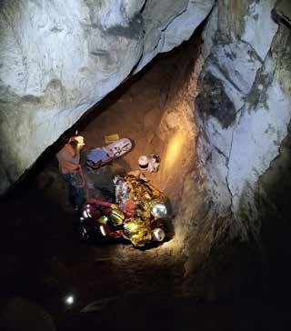 vorsorglich Erste-Hilfe-Material mit, der unter anderem Verbandsmaterial und Sirius-Rettungsdecken zum Wärmeerhalt in dieser feuchten und 8°C kalten Umgebung enthielt. Hypothermie stellt für einen immobilen Patienten eine der Hauptkomplikationen während seiner zeitintensiven Rettung dar.