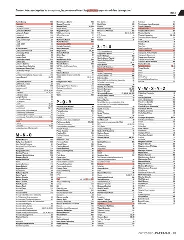 M-N-O Mackel Nicolas 117 Mahy Jean-Guibert 105 Main Capital Partners 61 Mangrove Capital Partners 78 Manpower 110 Margues Charles 123 Martino Pascal 105 Massard Marie-Hélène 123 Massaro David 30 Masset Philippe 100 Match 70 Matricia Solutions 112 Mayer Gabriel 46 Mayer Nicolas 122 McDonald’s 94 McKean David 12 Meier Pascal 119 Meisch Claude 40 Merkel Angela 54 Mertz Laurent 90 Metz Auguste 46 Meyers Paul 106 Michael Page 110 Microsoft 78 Ministère d’État 112 Ministère de l’Éducation nationale, de l’Enfance et de la Jeunesse 40 Ministère de l’Égalité des chances 42 Ministère de la Famille, de l’Intégration et à la Grande Région 48 Ministère de la Justice 80 Ministère des Finances 26, 27, 40, 87, 94 Ministère du Développement durable et des Infrastructures 22, 26, 48, 106 Ministère du Logement 60 Mischel Sylvie 42 MNKS 110 Monoprix 70 Morgenthaler Nathalie 52 Morrison Express 27
