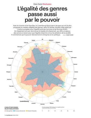 L’égalité des genres passe aussi par le pouvoir Avec la Lituanie et les Pays-Bas, le Luxembourg figure parmi les pays qui ont le plus progressé en matière d’égalité des genres, selon le Gender Equality Index édité par l’Institut européen pour l’égalité entre les hommes et les femmes (EIGE). Un classement annuel, dominé par la Suède et le Danemark, qui offre un aperçu des actions à mener pour que l’égalité s’exprime à tous les échelons de la société. Auteur THIERRY RAIZER À commencer par le pouvoir décisionnel en entreprise et en politique. UE