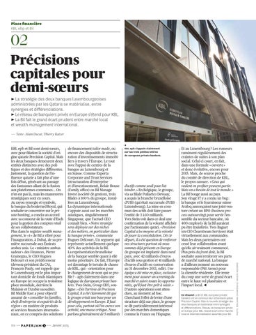 02 Précisions capitales pour demi-sœurs ► La stratégie des deux banques luxembourgeoises administrées par les Qataris se matérialise, entre synergies et différenciations. ► Le réseau de banquiers privés en Europe s’étend pour KBL. ► La Bil fait le grand écart prudent entre marché local et wealth management international.