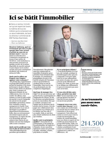 Ici se bâtit l’immobilier ► Dans un secteur immobilier qui est reparti de l’avant, la maîtrise de tous les métiers qui le composent est un atout indéniable, de l’avis du directeur commercial de BNP Paribas Real Estate. ― Interview : Jean-Marc Streit ― Photo : Luc Deflorenne Monsieur Limbourg, quel est l’événement qui vous a le plus marqué dans votre secteur d’activité au cours de ces derniers mois ? « Sans nul doute la recherche de la Commission européenne en locaux d’une surface de 58.000 m2. Cette institution va ainsi prendre possession de quelque un tiers de la surface disponible du marché national. Ce gros impact sur la surface vacante aura pour conséquence de générer une tension au niveau de l’offre. Quels sont les piliers sur lesquels vous comptez appuyer votre croissance ? « En premier lieu, l’appartenance au groupe BNP Paribas qui nous permet de bénéficier d’un réseau performant et de gérer efficacement certains clients sur plusieurs pays. Notre croissance est également tributaire de nos collaborateurs, force vive de la société. Par ailleurs, nous sommes à ce jour la seule société du marché à couvrir l’intégralité du cycle de vie des projets immobiliers (promotion, transaction, évaluation, property management et conseil). Nous allons poursuivre en ce sens et développer en parallèle le département Investissements. Enfin, dans un environnement nécessitant toujours plus de transparence, le respect des lois et la déontologie qui nous animent dans chacun de nos métiers sont une base indispensable à notre croissance. Quels sont les profils que vous avez le plus de mal à recruter ? « Plus particulièrement des personnes qui travaillent à