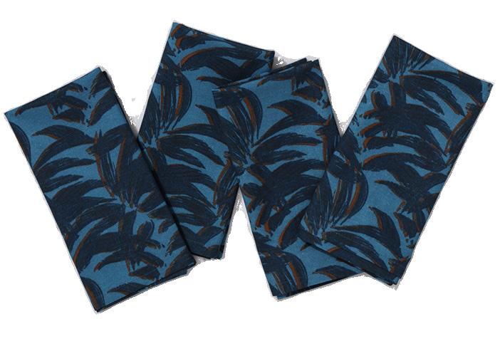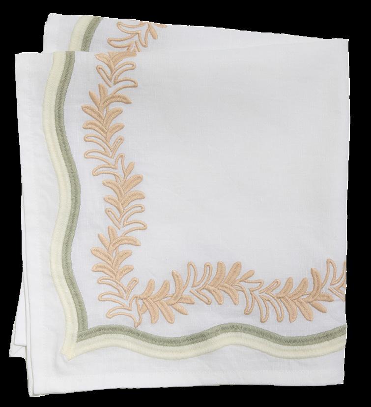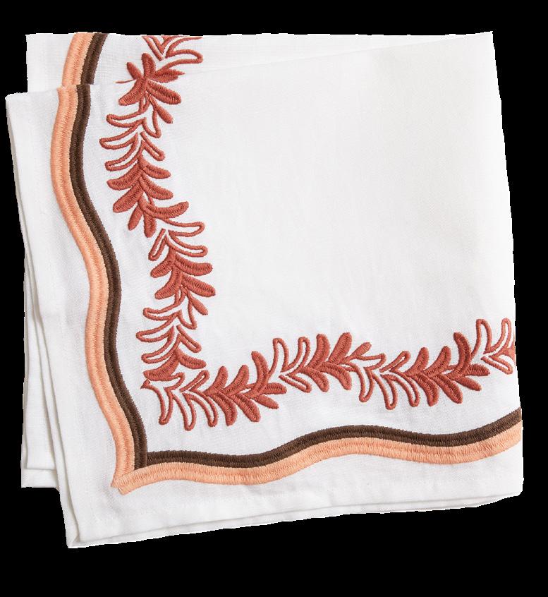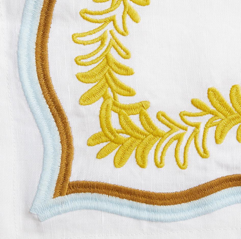 The tropical leaves of our Palmerie napkin add a fun, sophisticated layer to any table. This design is embroidered and includes a satin stitch scalloped trim, a contrasting detail that makes it easily usable with pieces you have at home. Palmerie napkins pair well with our Leyla and Primrose tablecloths.