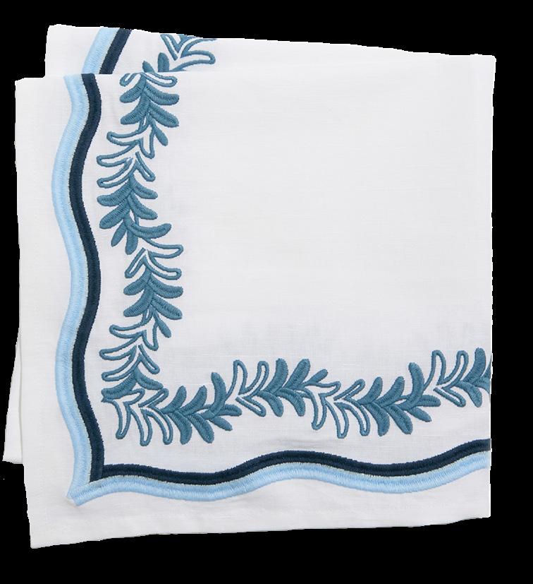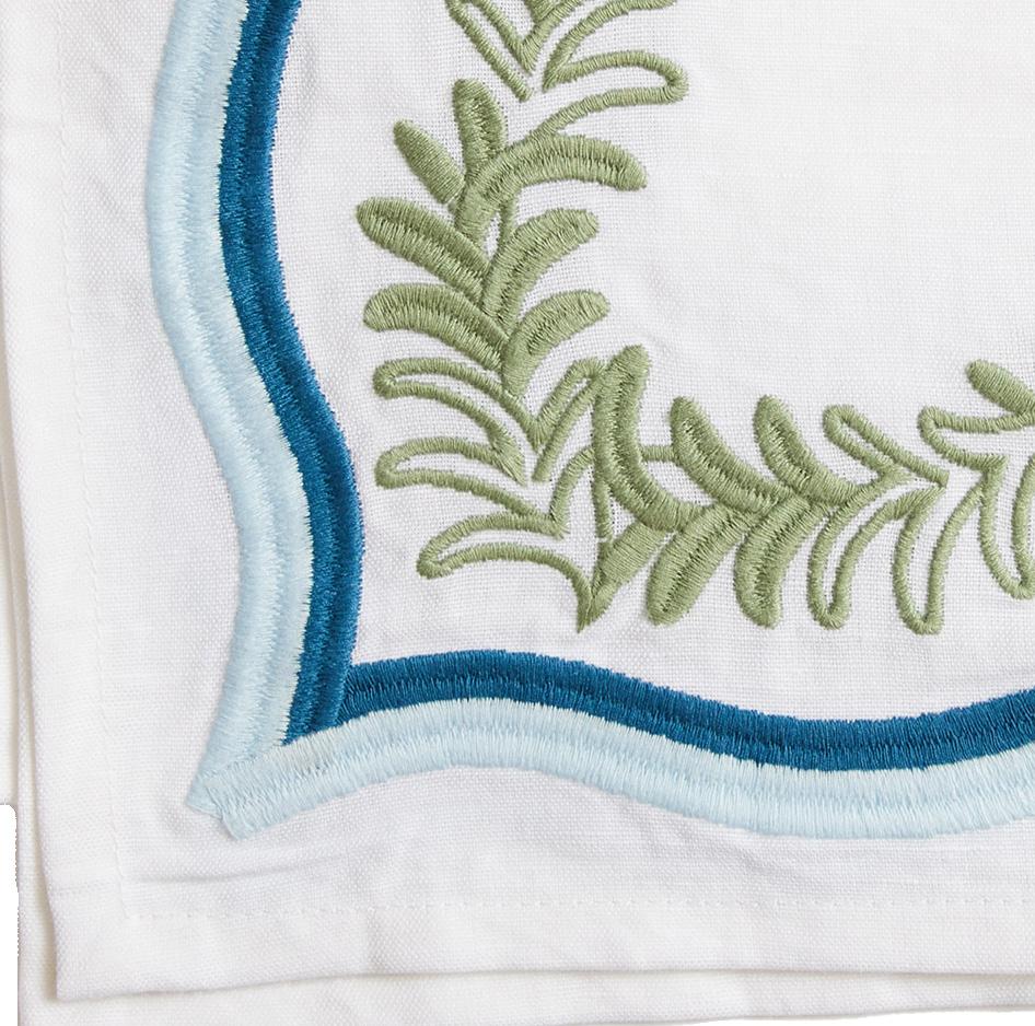 The tropical leaves of our Palmerie napkin add a fun, sophisticated layer to any table. This design is embroidered and includes a satin stitch scalloped trim, a contrasting detail that makes it easily usable with pieces you have at home. Palmerie napkins pair well with our Leyla and Primrose tablecloths.